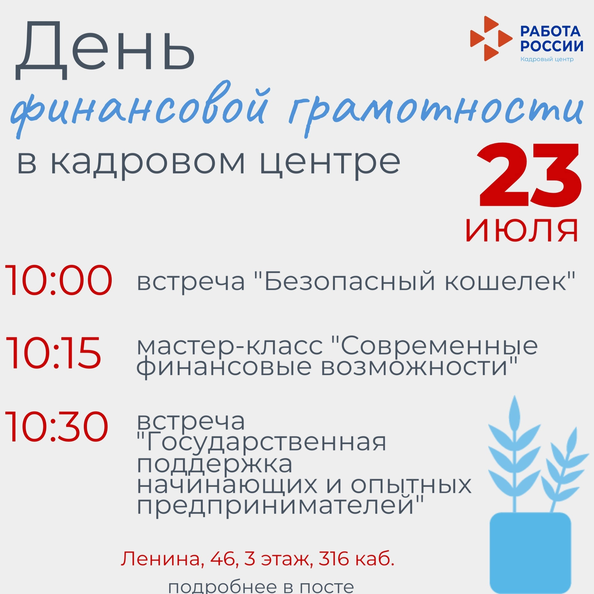 23 июля в кадровом центре Северодвинска (проспект Ленина, 46) пройдёт День финансовой грамотности.