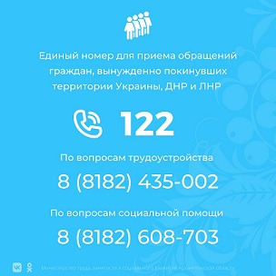 По вопросам оказания помощи гражданам, вынужденно покинувших территории Украины, ДНР и ЛНР просим обращаться по телефону горячей линии Архангельского областного центра социальной защиты населения 8(8182) 608-703 работает по будням с 9:00 до 17:00 (перерыв с 12:30 до 13:30).