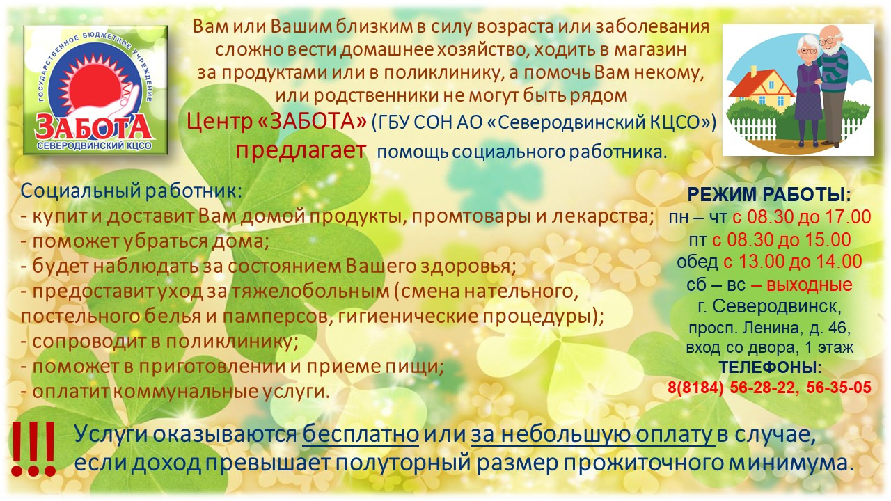 Вам или Вашим близким в силу возраста или заболевания сложно вести домашнее хозяйство, ходить в магазин за продуктами или в поликлинику, а помочь Вам некому, или родственники не могут быть рядом Центр «ЗАБОТА» (ГБУ СОН АО «Северодвинский КЦСО») предлагает помощь социального работника.