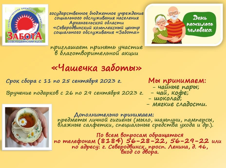 В преддверии Дня пожилого человека приглашаем неравнодушных жителей города Северодвинска принять участие в ежегодной благотворительной акции "Чашечка заботы".