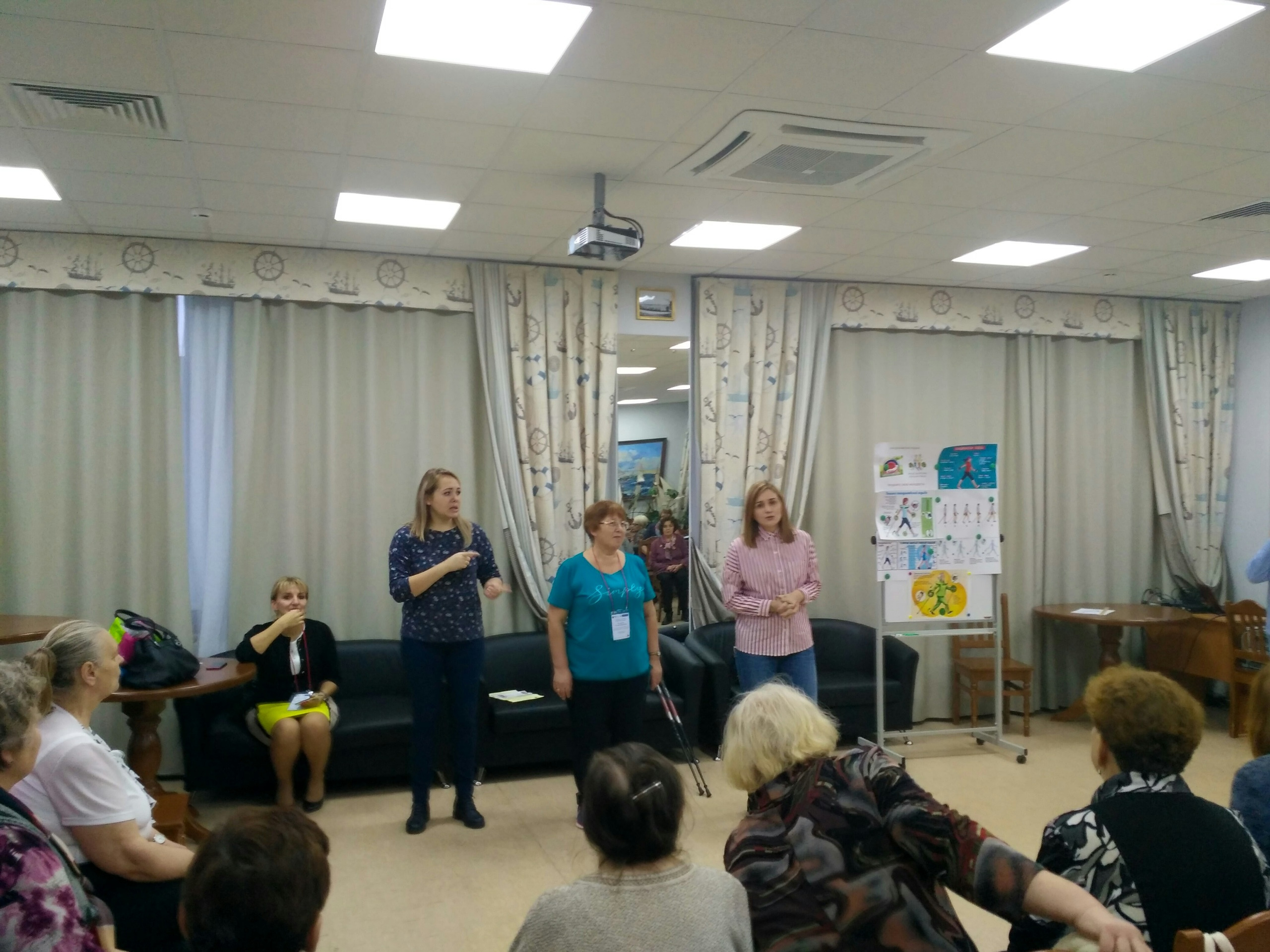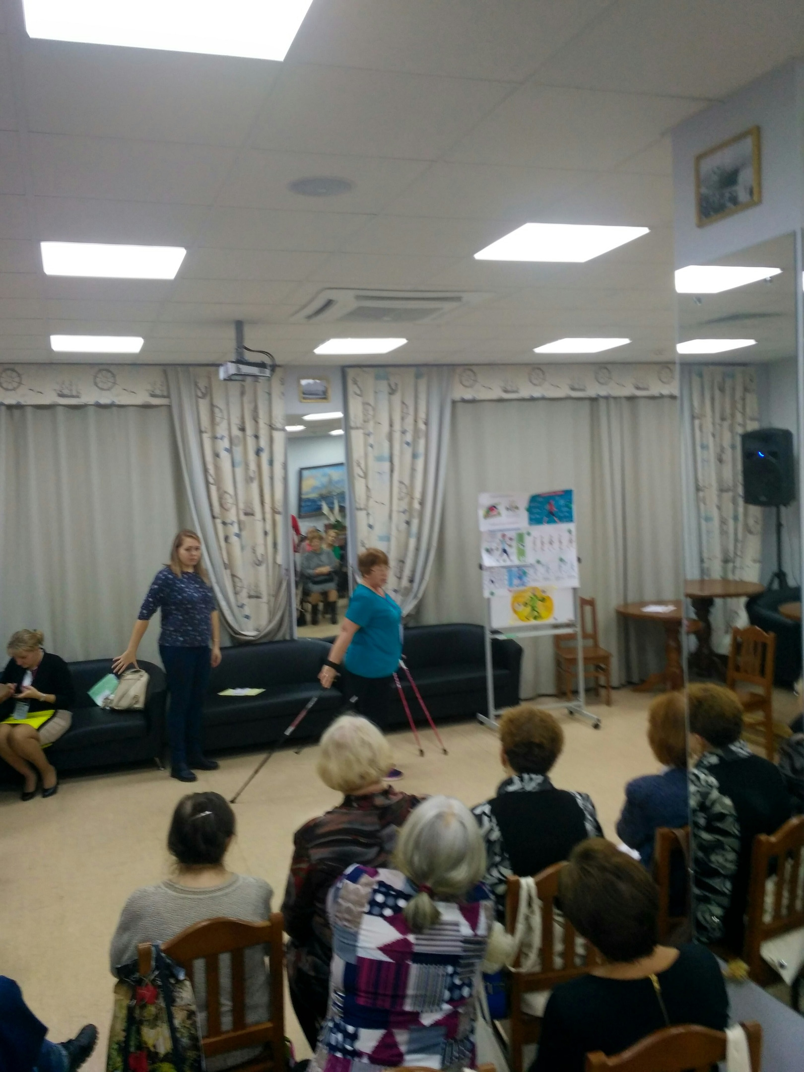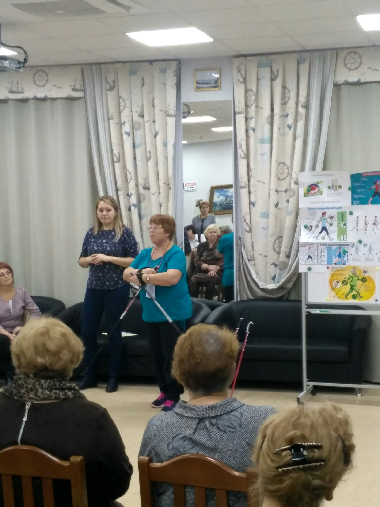 Инструктор по скандинавской ходьбе Центра «Забота» Палешева Татьяна Борисовна на своём мастер-классе рассказала о таком популярном виде спорта, как скандинавская ходьба, который представляет собой занятия на открытом воздухе со специальными палками. Ходьба особенно полезна для людей старшего возраста, поскольку позволяет решить проблемы опорно-двигательного аппарата.